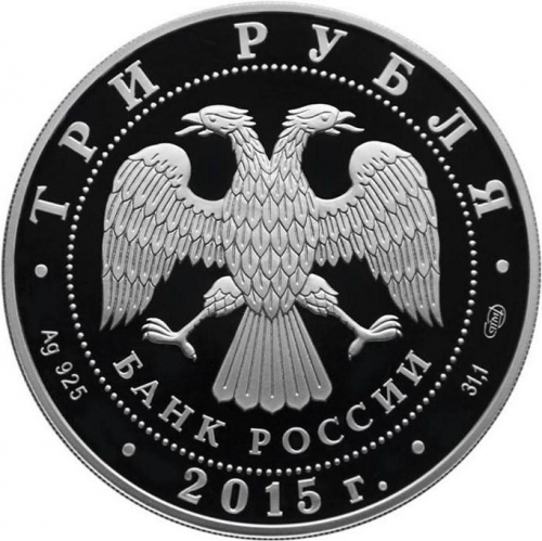 • Аверсы монет: в центре – эмблема Банка России (двуглавый орёл с опущенными крыльями, под ним – надпись полукругом "БАНК РОССИИ"), обрамленная кругом из точек и надписями по кругу – вверху: "ТРИ РУБЛЯ", внизу: слева – обозначения драгоценного металла и пробы сплава, в центре – год выпуска "2015 г.", справа – содержание химически чистого металла и товарный знак монетного двора.