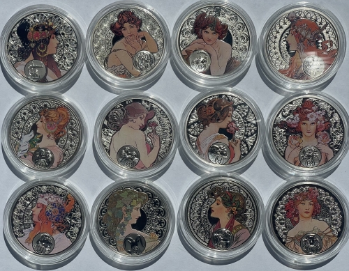 • Серебряные, памятные монеты из серии "А. Муха Знаки Зодиака (состоящий из 12 монет) , выпущены Филателическим и нумизматическим Бюро Ниуэ , являющимся официальным эмиссионным органом Правительства Острова Ниуэ , в связи со 150 годовщиной со дня рождения этого великого художника.