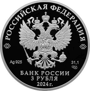 рельефное изображение Государственного герба Российской Федерации, над ним вдоль канта – надпись полукругом «РОССИЙСКАЯ ФЕДЕРАЦИЯ», обрамленная с обеих сторон сдвоенными ромбами, под гербом слева – обозначения драгоценного металла и пробы сплава, справа – содержание химически чистого металла и товарный знак монетного двора, внизу в центре в три строки – надпись «БАНК РОССИИ», номинал монеты «3 РУБЛЯ», год выпуска «2024 г.».