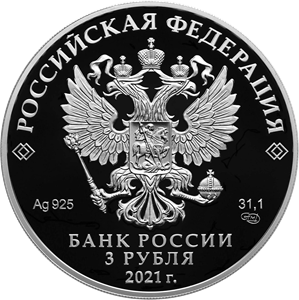 на зеркальном поле диска — рельефное изображение Государственного герба Российской Федерации, над ним вдоль канта — надпись полукругом: «РОССИЙСКАЯ ФЕДЕРАЦИЯ», обрамленная с обеих сторон сдвоенными ромбами, внизу под гербом: слева — обозначения драгоценного металла и пробы сплава, справа — содержание химически чистого металла и товарный знак монетного двора, внизу в центре в три строки — надпись: «БАНК РОССИИ», номинал монеты: «3 РУБЛЯ», год выпуска: «2021 г.».