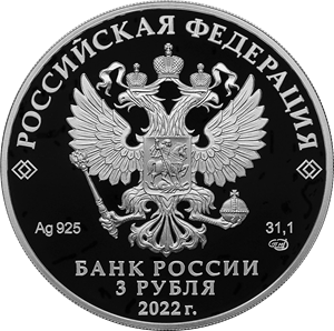 на зеркальном поле диска — рельефное изображение Государственного герба Российской Федерации, над ним вдоль канта — надпись полукругом: «РОССИЙСКАЯ ФЕДЕРАЦИЯ», обрамленная с обеих сторон сдвоенными ромбами, внизу под гербом: слева — обозначения драгоценного металла и пробы сплава, справа — содержание химически чистого металла и товарный знак монетного двора, внизу в центре в три строки — надпись: «БАНК РОССИИ», номинал монеты: «3 РУБЛЯ», год выпуска: «2022 г.».