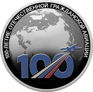 выполненный в цвете фрагмент логотипа «100 лет отечественной гражданской авиации» на фоне изображения земного шара, выполненного в технике лазерного матирования; по окружности – рельефная надпись «100-ЛЕТИЕ ОТЕЧЕСТВЕННОЙ ГРАЖДАНСКОЙ АВИАЦИИ».