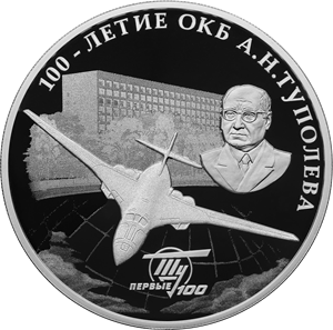 рельефные изображения портрета А.Н. Туполева, самолета и эмблемы 100-летия ОКБ А.Н. Туполева на фоне выполненных в технике лазерного матирования изображений здания конструкторского бюро, координатной сетки и облаков; вверху по окружности – рельефная надпись: «100-ЛЕТИЕ ОКБ А.Н. ТУПОЛЕВА».