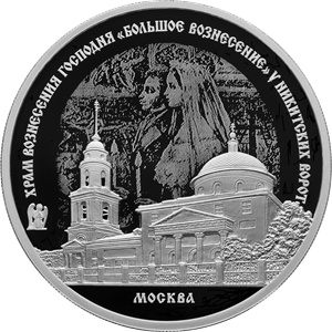 Серебряная монета 3 рубля "Храм Вознесения Господня "Большое Вознесение" у Никитских ворот г. Москва ,31,1г., 2024г., Proof