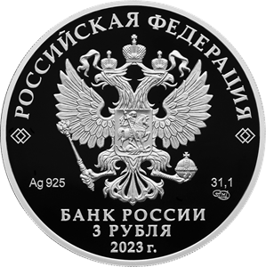 рельефное изображение Государственного герба Российской Федерации, над ним вдоль канта – надпись полукругом «РОССИЙСКАЯ ФЕДЕРАЦИЯ», обрамленная с обеих сторон сдвоенными ромбами, под гербом: слева – обозначения драгоценного металла и пробы сплава, справа – содержание химически чистого металла и товарный знак монетного двора, внизу в центре в три строки – надпись «БАНК РОССИИ», номинал монеты «3 РУБЛЯ», год выпуска «2023 г.».