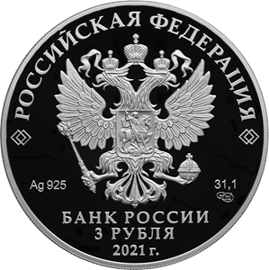 на зеркальном поле диска — рельефное изображение Государственного герба Российской Федерации, над ним вдоль канта — надпись полукругом: «РОССИЙСКАЯ ФЕДЕРАЦИЯ», обрамленная с обеих сторон сдвоенными ромбами, внизу под гербом: слева — обозначения драгоценного металла и пробы сплава, справа — содержание химически чистого металла и товарный знак монетного двора, внизу в центре в три строки — надпись: «БАНК РОССИИ», номинал монеты: «3 РУБЛЯ», год выпуска: «2021 г.».