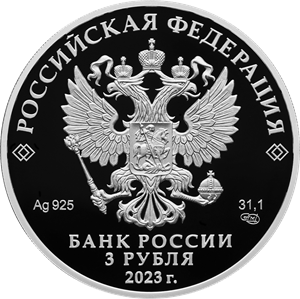 рельефное изображение Государственного герба Российской Федерации, над ним вдоль канта – надпись полукругом «РОССИЙСКАЯ ФЕДЕРАЦИЯ», обрамленная с обеих сторон сдвоенными ромбами, под гербом: слева – обозначения драгоценного металла и пробы сплава, справа – содержание химически чистого металла и товарный знак монетного двора, внизу в центре в три строки – надпись «БАНК РОССИИ», номинал монеты «3 РУБЛЯ», год выпуска «2023 г.».