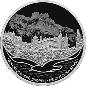 рельефное изображение Воронцовского дворца и парка на фоне выполненного в технике лазерного матирования изображения горы Ай-Петри, внизу – выполненный рельефом силуэт чайки, парящей над морскими волнами; внизу по окружности – надписи, обрамленные точками: «ВОРОНЦОВСКИЙ ДВОРЕЦ», «РЕСПУБЛИКА КРЫМ».