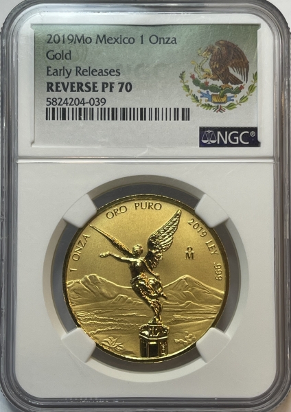 Золотая инвестиционная монета Мексики "Либертад" (Свобода) 31,1 грамм 2019 год, В СЛАБЕ NGC REVERS PF 70