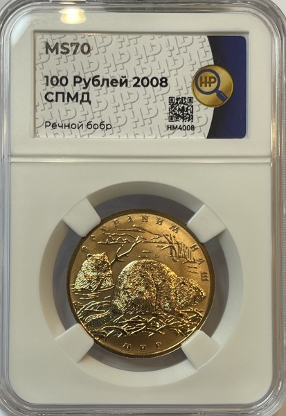 Золотая монета 100 рублей Бобр в слабе ННР MS 70