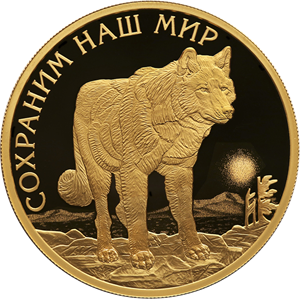 на зеркальном поле диска — рельефное изображение полярного волка на фоне изображений водной поверхности, скал и солнца; слева вверху вдоль канта — надпись: «СОХРАНИМ НАШ МИР».