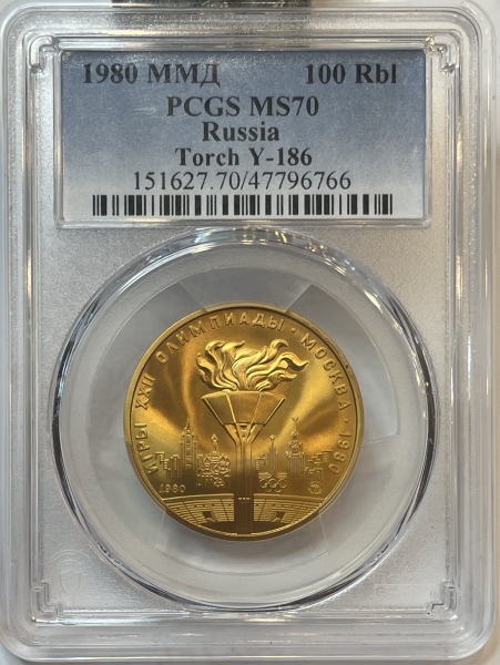 Золотая монета 100 рублей "Факел" Олимпиада 80, 1980г., в слабе PCGS MS 70