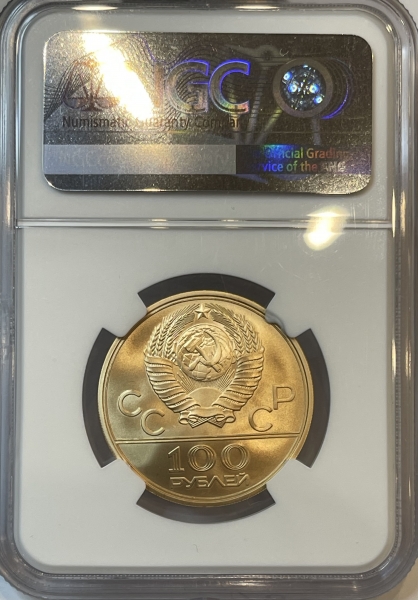 Сверху герб СССР с 15 витками ленты, слева от него буквы «СС», справа «СР», ниже двойная черта, под ней обозначение достоинства монеты цифра «100» и ниже слово «РУБЛЕЙ».