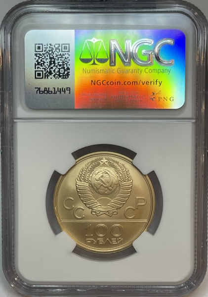 Золотая монета 100 рублей "Спортивный зал Дружба" Олимпиада 80, 1979г., в слабе NGC MS 70