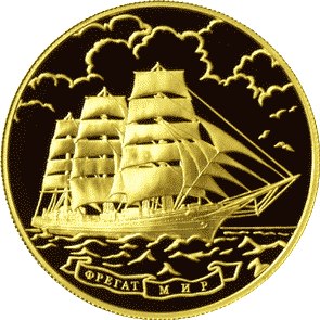 изображение плывущего фрегата «Мир», внизу на ленте – надпись: «ФРЕГАТ «МИР».+