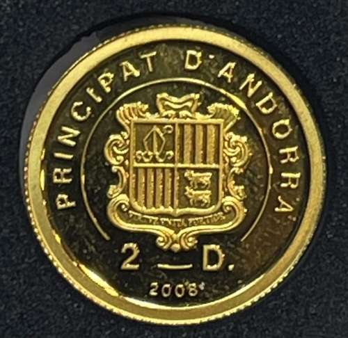 Золотая монета 2 динер "Скульптура Пьета" Работа Микеланджело 2008г., Андорра, Au 999, 1г.