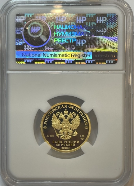Золотая монета 50 рублей "Белка обыкновенная" 7,78г., Au 999, 2023г., в слабе ННР PROOF 70