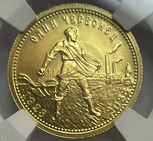 Однако для оборота выпускали не только бумажные деньги. С 1923 года на Петроградском монетном дворе начали выпускать золотые монеты-червонцы, которые по своим параметрам повторяли царские 10 рублей. Их дизайн был разработан медальером Антоном Васютинским на основе эскиза для одной из дореволюционных сельскохозяйственных выставок. На монете в полный рост изображен крестьянин-сеятель на фоне дымящихся труб, плуга и восходящего солнца. Золотых червонцев, датированных 1923 годом, было выпущено чуть более 2,7 млн штук.