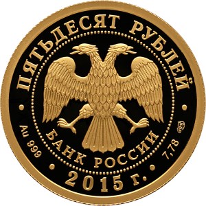 в центре – эмблема Банка России (двуглавый орёл с опущенными крыльями, под ним – надпись полукругом "БАНК РОССИИ"), обрамленная кругом из точек и надписями по кругу – вверху: "ПЯТЬДЕСЯТ РУБЛЕЙ", внизу: слева – обозначения драгоценного металла и пробы сплава, в центре – дата выпуска "2015 г.", справа – содержание химически чистого металла и товарный знак монетного двора.