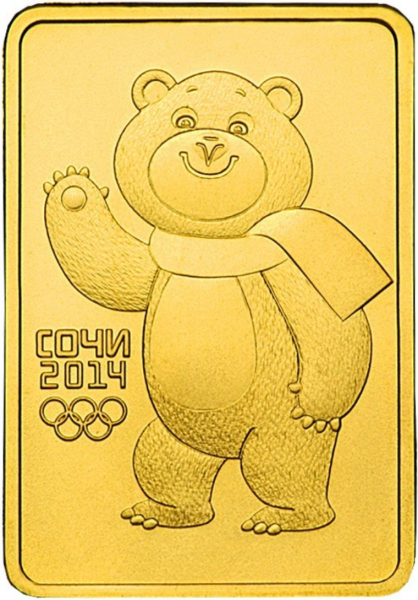 рельефное изображение Белого Мишки - официального талисмана XXII Олимпийских зимних игр 2014 года в г. Сочи, слева от него в две строки - надпись: "СОЧИ" и дата: "2014", под ними - пять Олимпийских колец.
