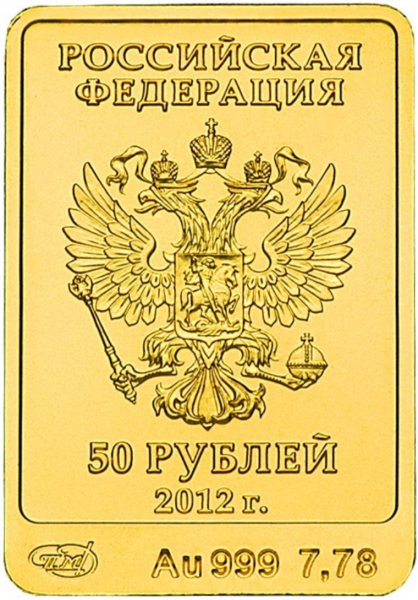в центре - рельефное изображение Государственного герба Российской Федерации, над ним - надпись в две строки: "РОССИЙСКАЯ ФЕДЕРАЦИЯ", под гербом в две строки - номинал монеты: "50 РУБЛЕЙ" и год выпуска: "2012 г.", внизу вдоль канта обозначения: слева - товарного знака монетного двора, в центре - металла по Периодической системе элементов Д.М. Менделеева и пробы сплава, справа - содержания драгоценного металла в чистоте.